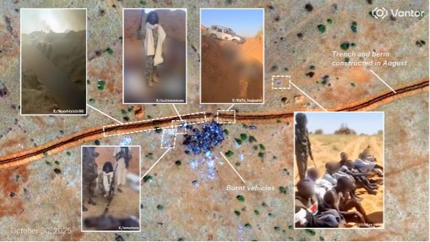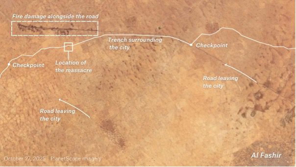 Footage posted on social media showed a mass killing more than seven kilometres outside the city, where the fleeing convoy had encountered an earthen berm encircling Al Fashir. The berm and an accompanying trench were build by the RSF during the siege. Satellite imagery indicates that the section to the north-west of the city, where the mass killing took place, was constructed throughout August.