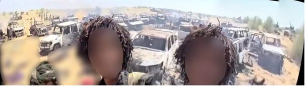 In several other videos, one fleeing vehicle appears to have crossed the berm before becoming stuck in the trench on the far side. In one of these videos, filmed from inside the trench, a fighter can be seen firing into a group of motionless bodies on the ground next to the car, while others film and celebrate.