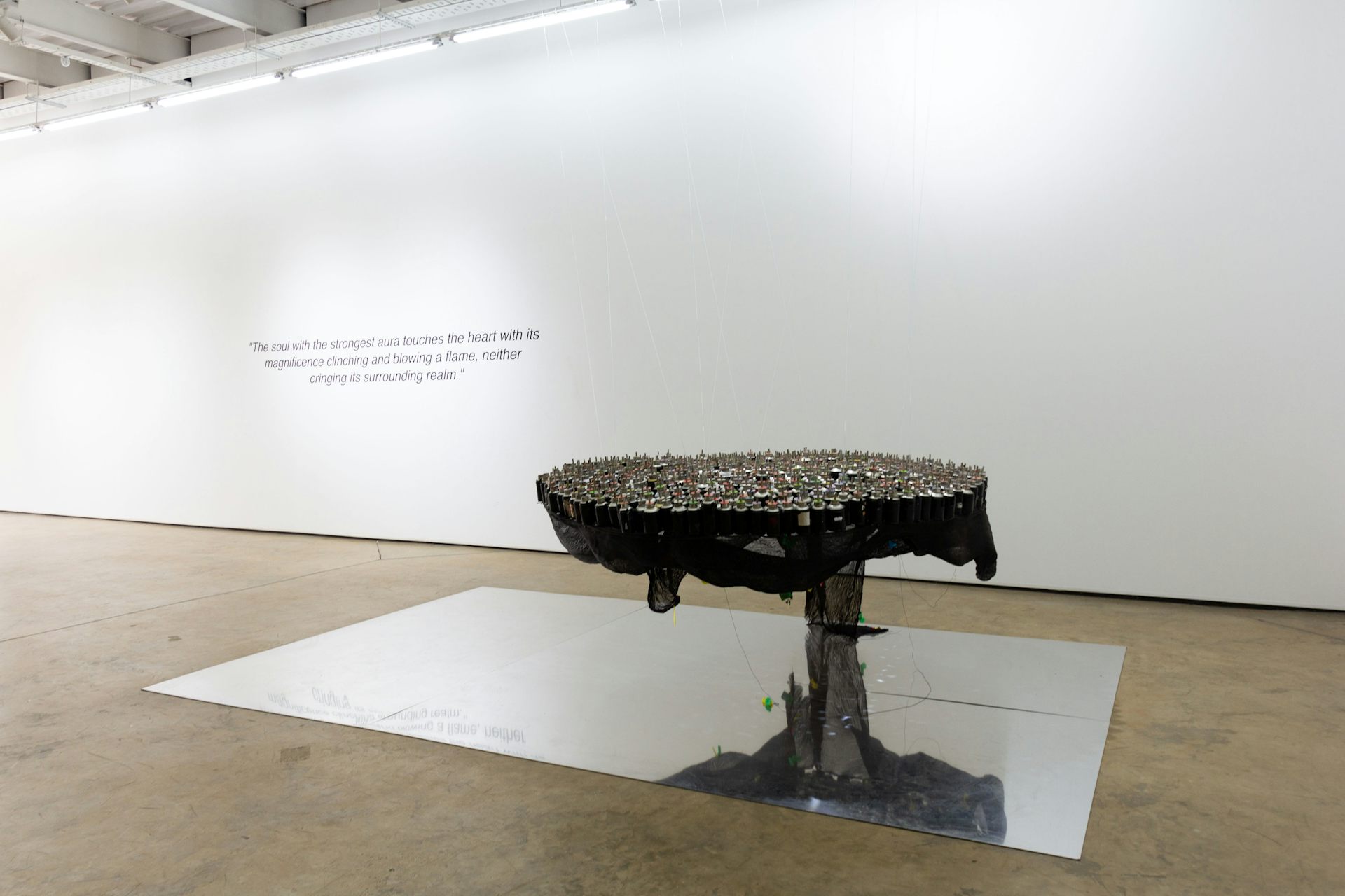 The exhibition draws the viewer in with sound created by Tibetan bowls that create music when touched with clappers. Mwangi wants the healing sound to invite visitors to take part in the exhibition and be present instead of absent. Aluminium mirrors in the works take the idea further. For Mwangi they allow people to see themselves in the space and to be in collaboration with the artworks.
