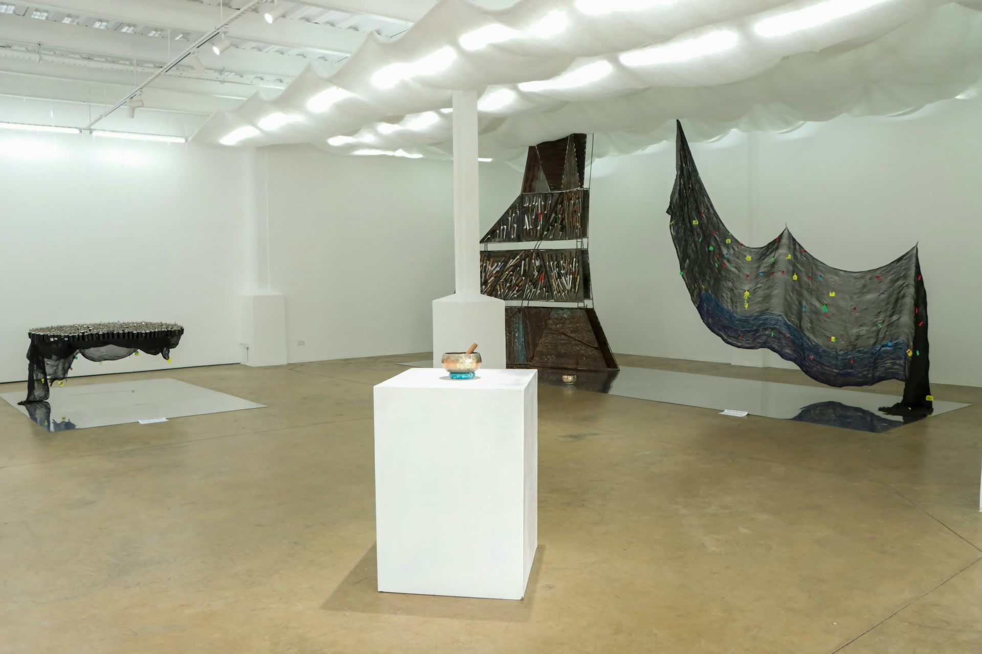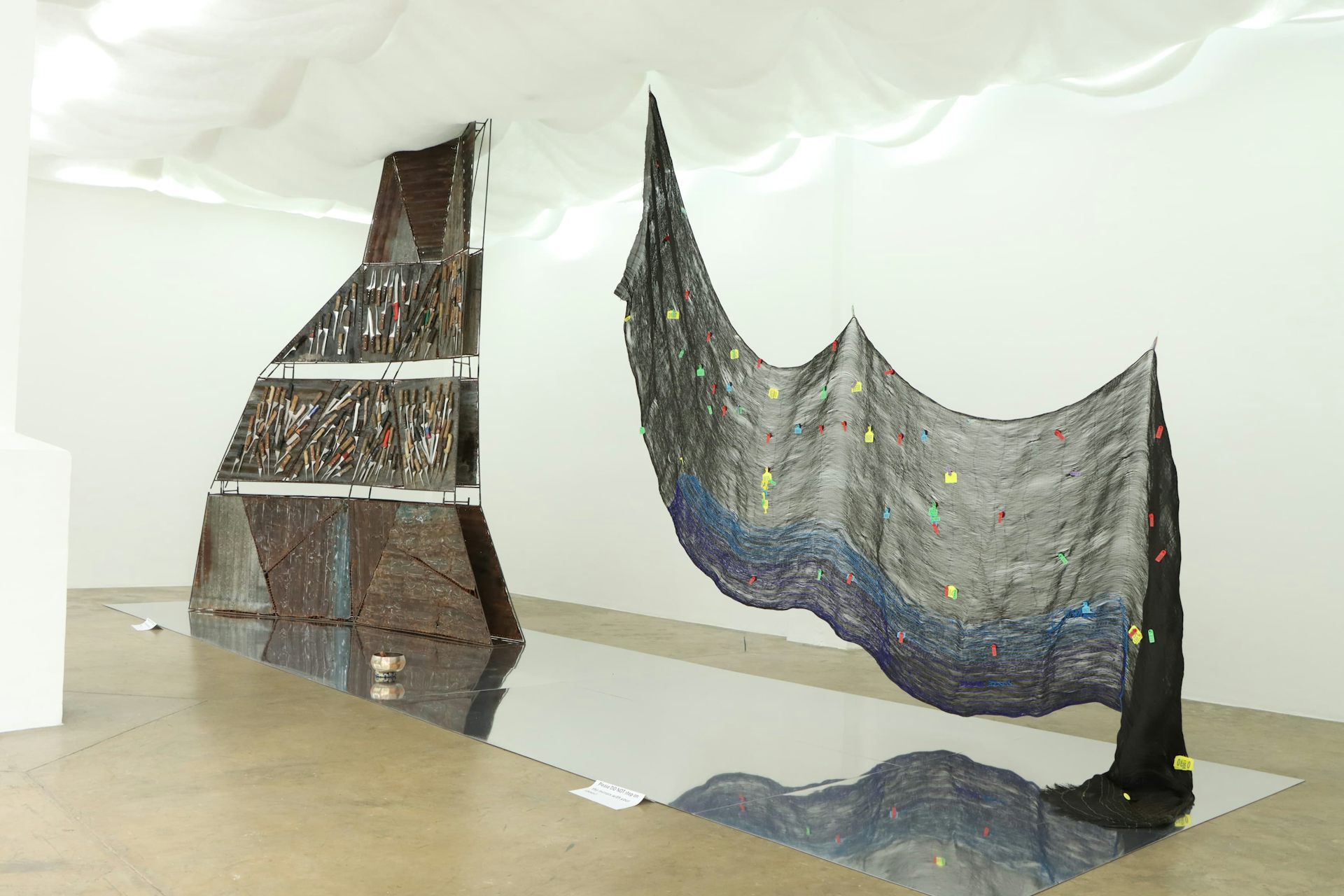 Visitors to In the Absence at The African Arts Trust Gallery are greeted by large installations. Draped materials hang from a pillowy sky, razor sharp knives are welded to rusty iron sheets, suspended lanterns reflect off aluminium mirrors and poems are written on walls.