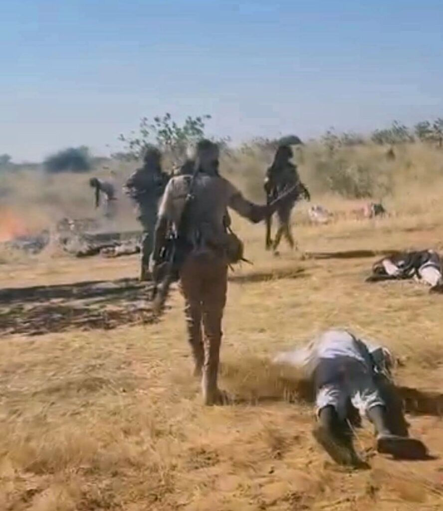 In another video, fighters stand in a trench, guns raised, shouting cries of victory. All around them lie corpses in the sand, as vehicles burn in the distance – presumably vehicles that those people had tried to use to escape.